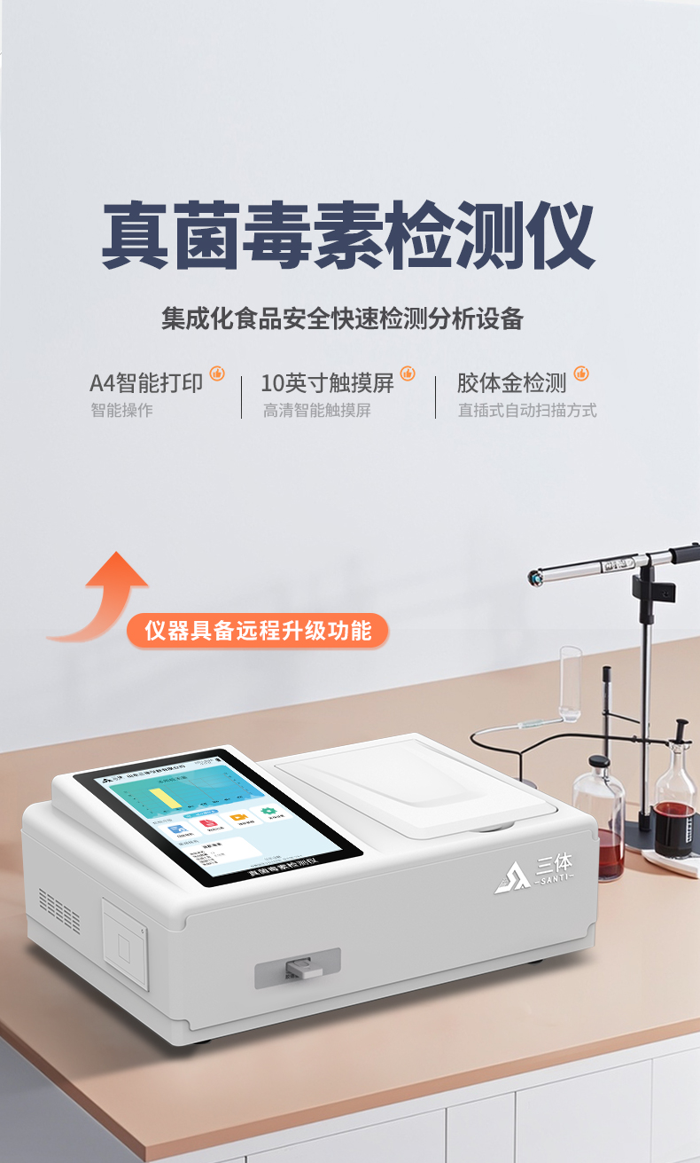 山东三体仪器有限公司生产的真菌毒素检测仪应用竞争抑制免疫层析的技术原理,通过就是通过待检测物与抗体结合的方法,分析待检样品中真菌毒素残留。可快速检测粮食、饲料、谷物、食用油、调味品中如玉米、大米、小麦、大麦、糙米、麸皮、稻谷、豆粕、米糠、饲料中的黄曲霉毒素B1、M1、总量,玉米赤霉烯酮、呕吐毒素、T2