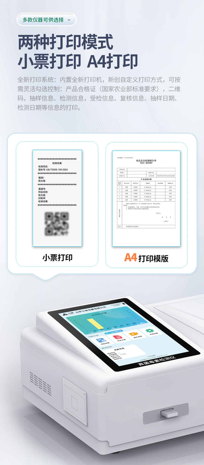 10、A4纸版本报告打印功能:设备拥有两种结果展示方式,可以自动生成A4打印模板和小票打印模板两种样式,可通过WiFi及网线等方式链接外置打印机可进行打印
