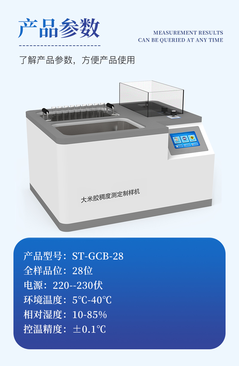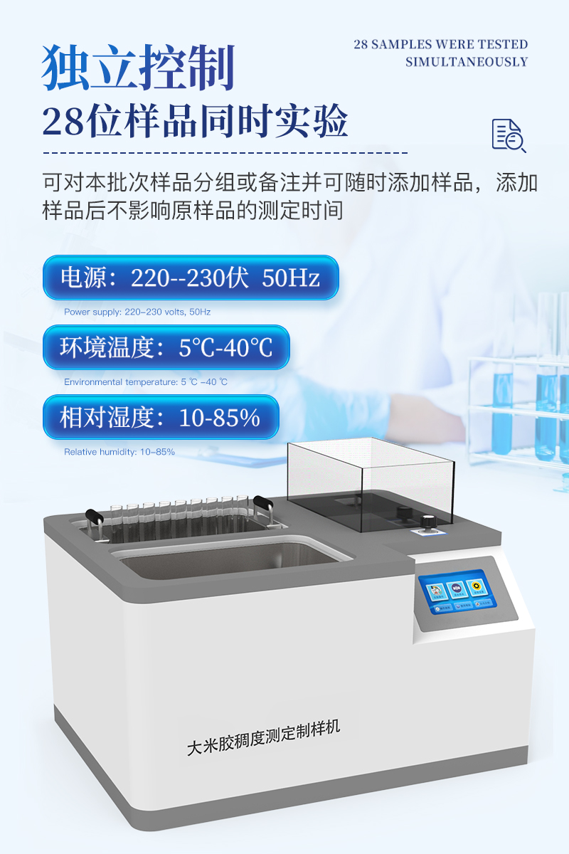 1、用途:适用于粮油检测大米胶稠度的测量配套设备,满足GB/T22294-2008标准要求。2、工作条件:2.1电源:220--230伏, 50Hz;环境温度:5℃-40℃;相对湿度:10-85%3、技术指标要求★全样品位:28位,★可同时满足制胶过程和冰水浴操作。制胶和冰水浴可在屏上独立操控,互不影响。★制胶控