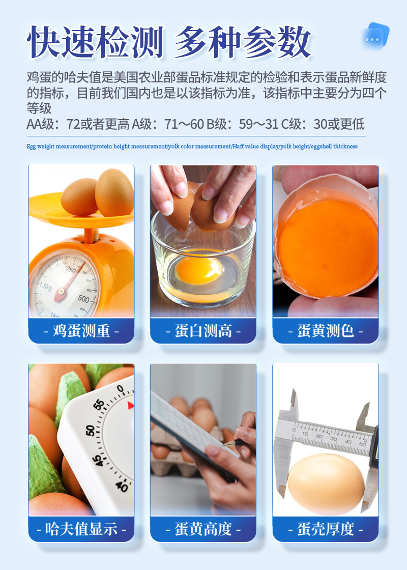 鸡蛋品质分析仪技术指标:鸡蛋测重,蛋白测高,蛋黄测色,哈夫值显示,蛋黄高度,蛋壳厚度等,可进行鸡蛋等级计算。鸡蛋的哈夫值是美国农业部蛋品标准规定的检验和表示蛋品新鲜度的指标,目前我们国内也是以该指标为准,该指标中主要分为四个等级,AA级:72或者更高;A级:71~60;B级:59~31;C级:30或更低。