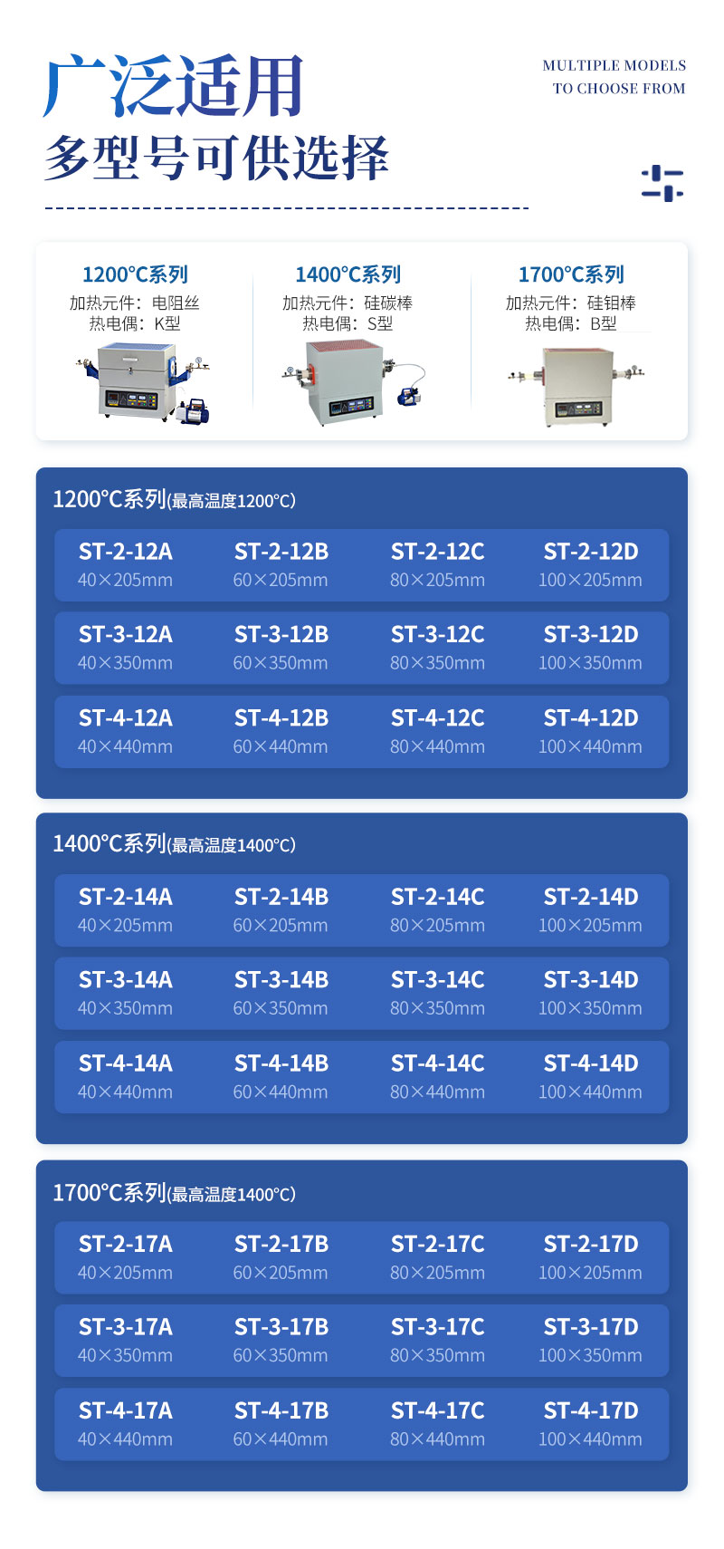 4. 采用成熟技术,有单管、双管等多管,卧式、可开启式、立式、单温区、双温区、三温区、四温区、五温区等多种管式炉型;可选择配置耐热钢、高纯石英玻璃、刚玉陶瓷等材料炉管,均温区长,操作简便,密封可靠,综合性能指标较高。